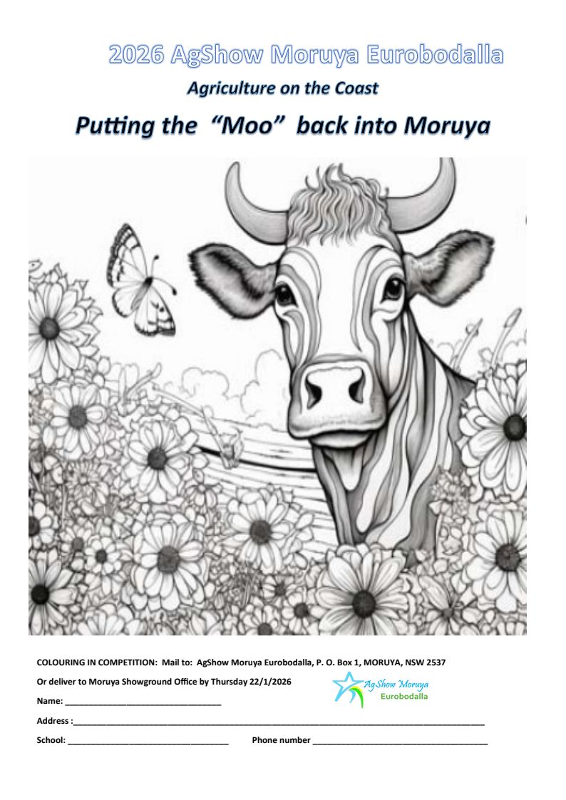 Just print the one you want, Colour it in, fill out your Name, Age, and Address, then return it to the Secretary at EDSS, PO Box 1, Moruya, NSW 2537, or drop it into the Secretary’s Office at the Moruya Showground by Thursday, the 22nd of January 2026.